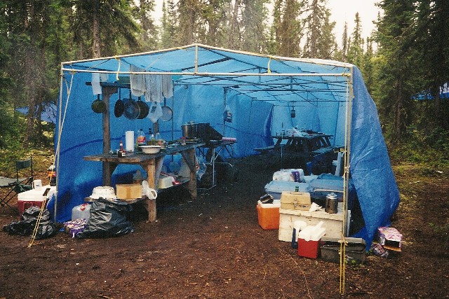 Our trip north had been thankfully uneventful, with no flats or other breakdowns. We did meet Albert Eckel, one of last years veterans, and his crew on their way out. Someone in his convoy was having tire trouble, which is no surprise at all on those brutal gravel roads. The only good thing about the rigorous drive up to the lake is that it keeps the less adventurous at home, leaving Costigan to those interested in a challenge just to get there. I would also like to take a moment at this point to acknowledge all those involved in the arduous task of surveying and building the quad track into the lake. Without their efforts, none of us would have had the extreme pleasure of this, or other trips. Vic was sharing with me on the drive up how difficult it was just to find a passable trail to the lake, with many failed attempts before the right path could be found. Then began the extremely difficult task of clearing the bush on the way to the lake. All I can say is that those who go nowadays owe those who cleared the way a huge debt. Unfortunately, it is almost too good a road now, as we pulled up to the shore where the boats are launched, low and behold if someone hadn't driven their 4 x 4 pickup in that far! What next, a pier? I guess the only bright side is that it's a huge lake where you can fish the entire day and not see another soul if that's your desire, or it's easy enough to find your buddies for shore lunch once you get the lay of the lake. Now I had said that there were no problems on the drive up, this is not to say the boys did not have any problems on the lake. It seems Pat figured his boat was the Titanic, because he had launched it, loaded it up with gear on shore, and shoved off to begin the ride to camp, when he noticed it was a little low in the stern. He had forgot to put the plug in!! Unfortunately, George did not have the video camera running because it was a $10,000 prize winner for sure. First Pat tried to find the plug and then move the gear to stop the leak, but he quickly gave that up and decided the best alternative was to paddle back to shore, and then when he got close enough he jumped in to pull it the rest of the way. Needless to say Pat was relieved his trip