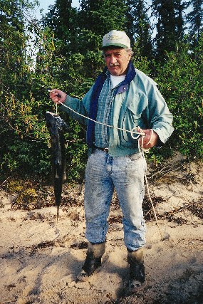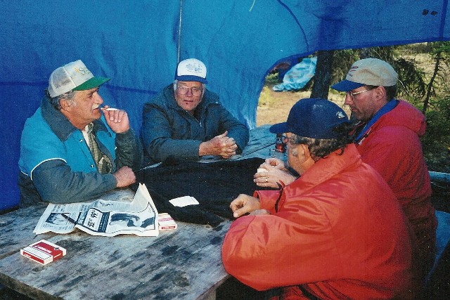 I can t forget to relate one little incident. On our way back to camp the first day, we were traveling with the rookies. Vic was in the boat with Pat and George, while Mario, Aaron and Darrin were in another boat. We had just crossed the main sandbar separating the lake we frequently fished and were about to head home. We all looked at Vic and said "Which way?" Vic looked at Gene and asked "Didn't you say you had a map? I don't pay much attention to where we go because I never drive the boat." Everybody just started laughing and we headed off in what turned out to be the right direction. Both Gene and I had paid fairly close attention this trip, and it felt good to have a certain degree of familiarity with the surroundings this trip. Now I don't profess to be a guide of Don's caliber, that will take years of getting lost and finding my way home before that happens, if ever. I think Gene just wants me to get lost and not find my way back. It is a good thing we stuck close because Pat ran out of gas about halfway back to camp. Vic claimed it was due to his huge trout being dragged beside the boat while they trolled; that affected the gas consumption Gene pulled out his spare can and we were soon on our way again, after another laugh at Vic's expense. This time we watched him puzzle over how the spout went back in the gas can; I later learned most Saskatchewan farmers don't use gas cans. Why bother when there are so many five gallon grease pails and short lengths of siphon hose or funnels made out of old oil cans around? All part of that reduce, reuse & recycle philosophy I have heard so much about. What a pleasure to be fishing with such an environmentally concerned bunch! One of the highlights of my trip occurred that night, when Vic and I teamed up against Don and Doug for a game of Kaiser. On the way up I had casually mentioned I was still mystified by the game, so Vic offered to show me the ropes. I agreed once it became clear that there was no money involved, not that I have ever been fleeced before, goodness no. I must admit that through a combination