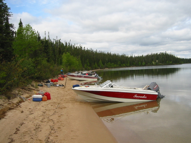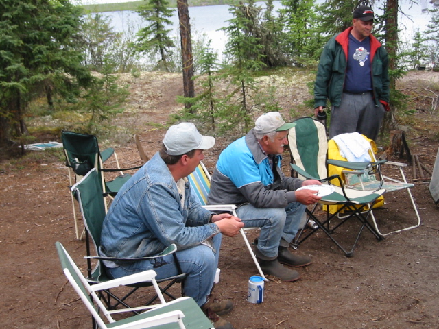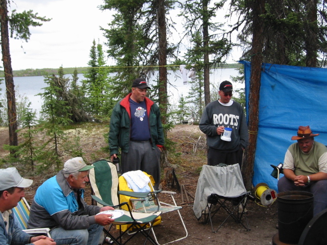 Then, there was the other point of view, as Vic so eloquently put it, "Let those Kindersley Boys sleep on the beach. It'll teach them to come back to camp by supper time." He got no argument from anyone in camp. Besides, the conversation around the fire was quite engaging. Vic proclaimed that, along with the pool money, Eddy was a bonus prize for the pool winner. Eddy put up no real argument. This prompted Vic to comment that all the other rookies usually put up a bit of a fight for the first couple of days. But, Eddy was such a good sport, he bought into the concept right away. I referred to Eddy as a rookie. I should clarify though, rookie for him means on the Costigan Lake trip. He is probably one of the most experienced fishermen l have met. I think he had decided, however, the best way to avoid being someone else's Pool prize was to win it himself, which he set out to do. |