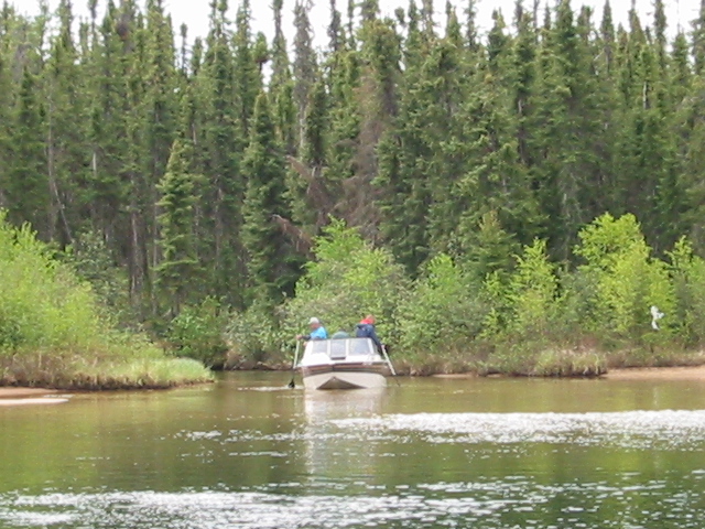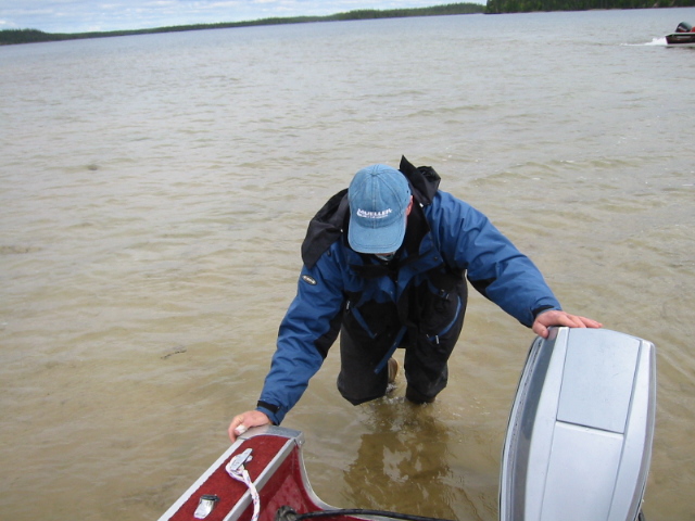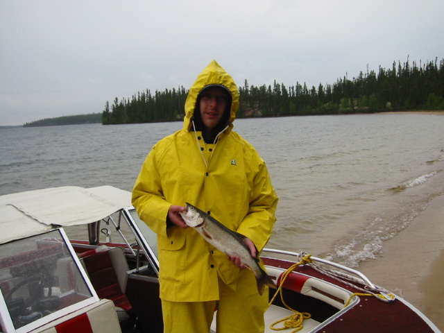 The serious fishing began Monday morning, with the Pool rules explained to everyone sober enough to listen. For the uninitiated, everyone kicks in $10 and the guys who catch the longest jackfish and laker split the pool. The highlight of the morning was when we were all preparing to shove off and Jason K. came down to shore in his lovely, form fitting, wading outfit. It was stunning really! The boys couldn't help but admire his guts, wearing that get up. It was actually a nice pair of fly fishing waders and kept him drier than the rest of us. But, you have to wonder if being dry was worth the B.S. he had to put up with nightly. He was a good sport about it though, as rookies have to be. Why, he wore them the whole trip, so obviously we weren't too hard on him. The fishing that day was good, but not