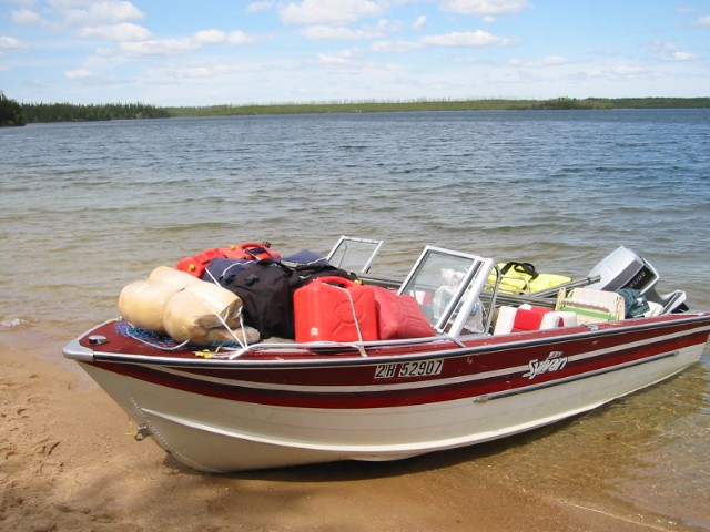 We should have known how it was going to go when on our way back from the morning fish we spied Darrin's boat flagging us down We thought it odd because we could see they were moving. The other odd part was that they still had all the gear in the boat that they had when they left earlier in the morning. Their plan was to fix up Darrin's trailer, so they had packed and left first thing, foregoing the fishing. When we pulled up along side, Darrin said, "Which way to the boat launch?" We all had a good laugh and then Gene and I looked at each other to see if we knew the way ourselves. We did manage to point them in the right direction and went back to break camp ourselves. There was the usual commotion at the launch but all went pretty well. It wasn't until the trucks were almost back to the highway that things went south. Matt was driving Tim's truck up a sandy hill when it spun out and sideswiped a tree. The damage didn't affect the performance of the truck but they were stuck, and the chainsaw had gone to Pinehouse with Darrin's truck. Again with ingenuity and sweat, all the boys managed to get everything out to the road, eventually. Obviously Tim wasn't too upset with Matt. They rode to Pinehouse together and arrived still speaking to each other. Isn't insurance wonderful Now the sad part. We get to Pinehouse Lake,