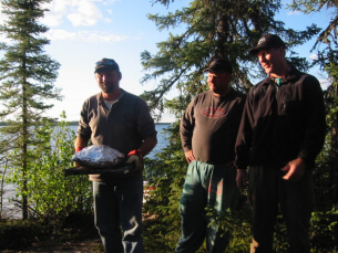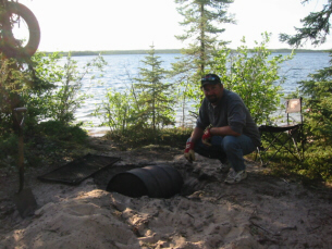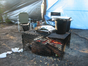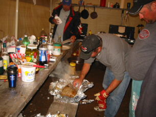 one boat while Brad and Matt were in the other. Tim had his boating skills tested as he maneuvered to get Greg and I unhooked from a snag. As it turned out we were both snagged on the same log! Greg, using his brute strength, busted his Rhino rod while trying to free his hook. Amazingly, he was only a little pissed off; Tim figured those anger management courses were really working for him. However, it just wasn't Greg's day. While attempting to release a big jack, he hooked his finger deep, which got more than a little exciting when the jack got out of the net! Tim couldn't stand to the sight of Greg hooked like that, and just about bowled me over as he ran to the bow of the boat. I wanted to amputate but Greg declined. In the end we did manage to remove it without major surgery. Today was roast day so Greg prepared it early: He seasoned it, wrapped it in saran wrap, then foil, then wet newspaper and then more foil. A bed of coals was prepared in the pit we had dug the day before, then Greg buried the package in coals and covered it with half a barrel we had salvaged.