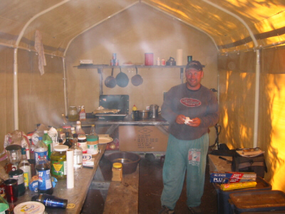 In the nightly smear card game Gene had to come to our rescue as Vic had won four straight games! On a bright note I finally won a game too, which proves that luck can still prevail over skill. Brad tried to interrupt the smear game when he asked Tim to stitch his finger. Brad must have missed that Boy Scout meeting about knife safety. Tim just told him to go to Pinehouse, he was busy playing cards. Thankfully someone was able to find Brad a band-aid as the smearfest continued. |